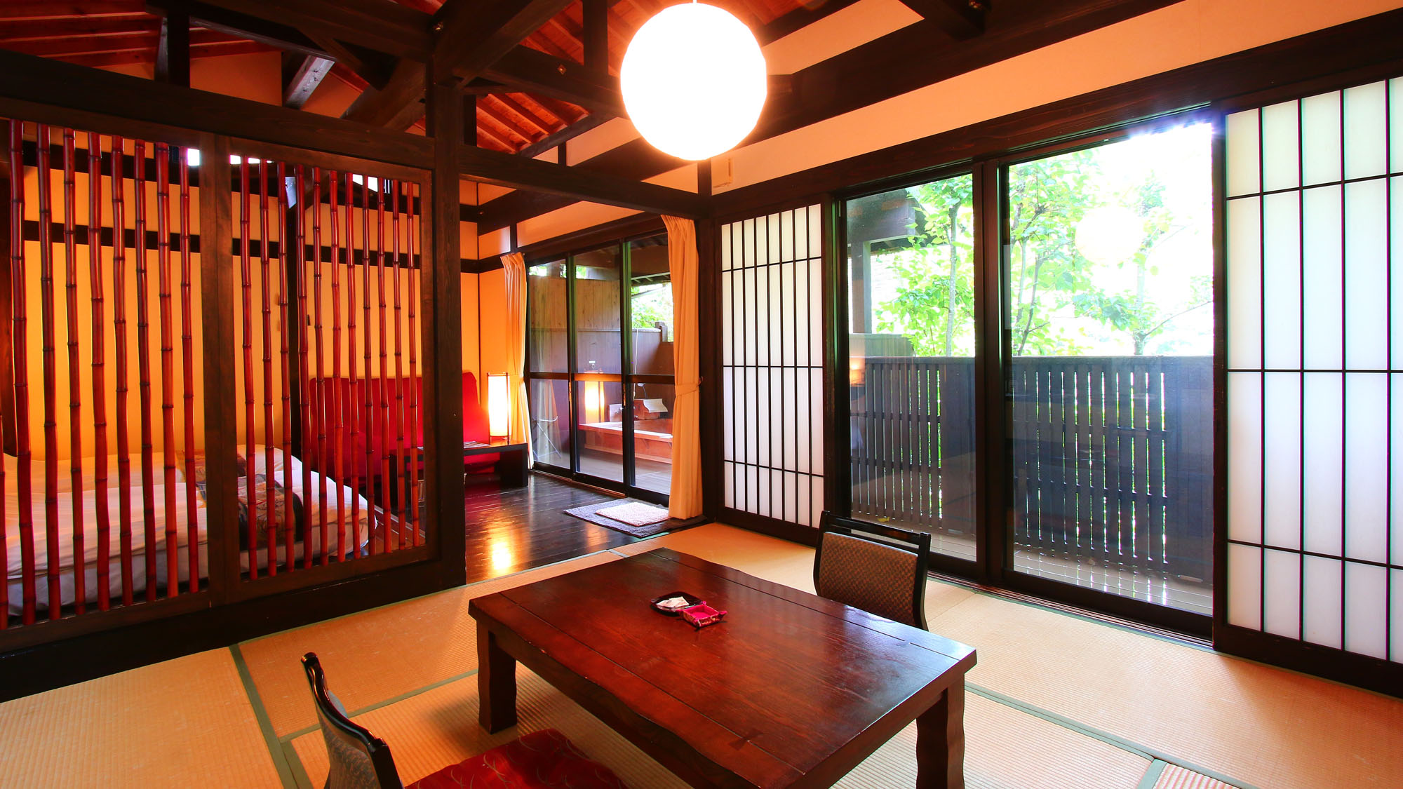 全室露天風呂付きのお部屋で、のんびりぬる湯を楽しめる「山あかり」。
