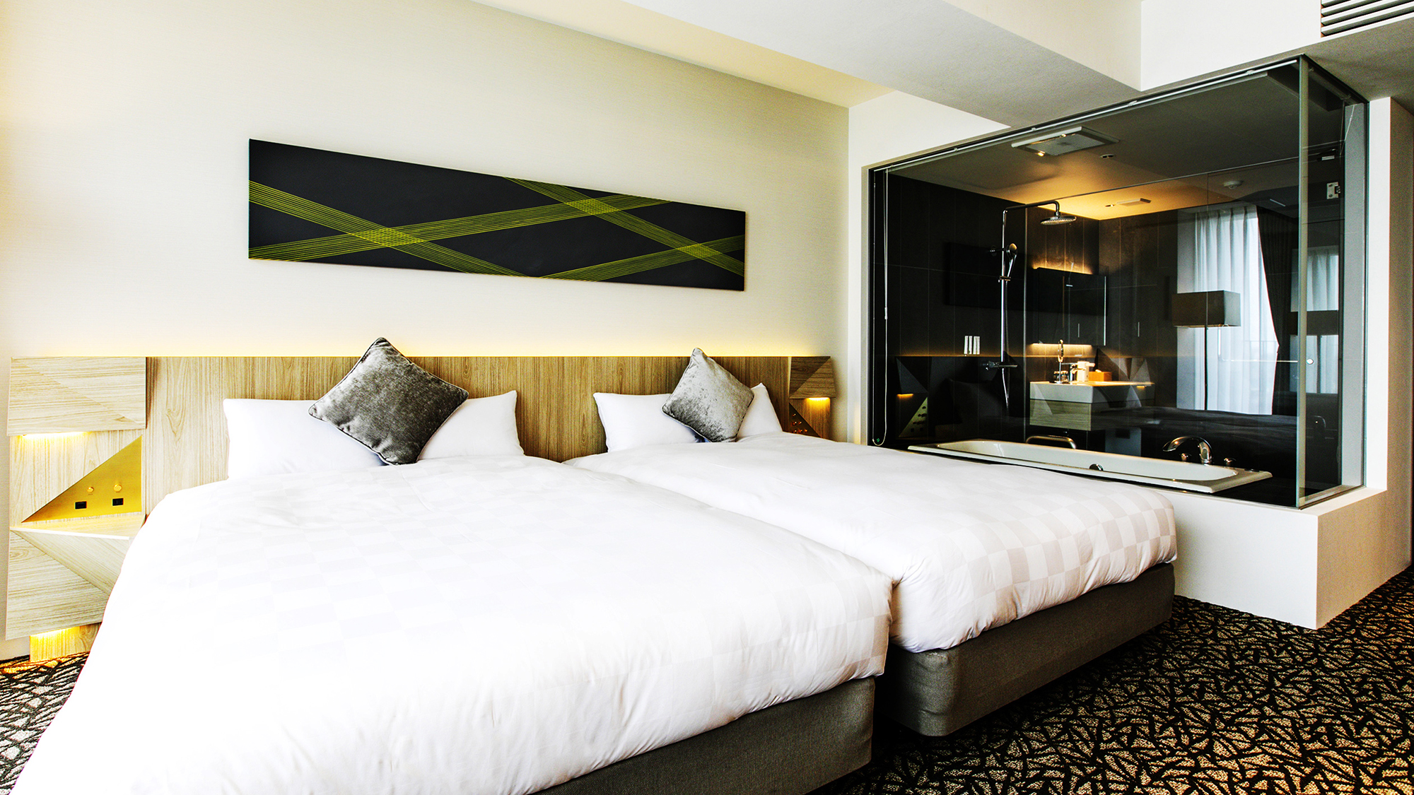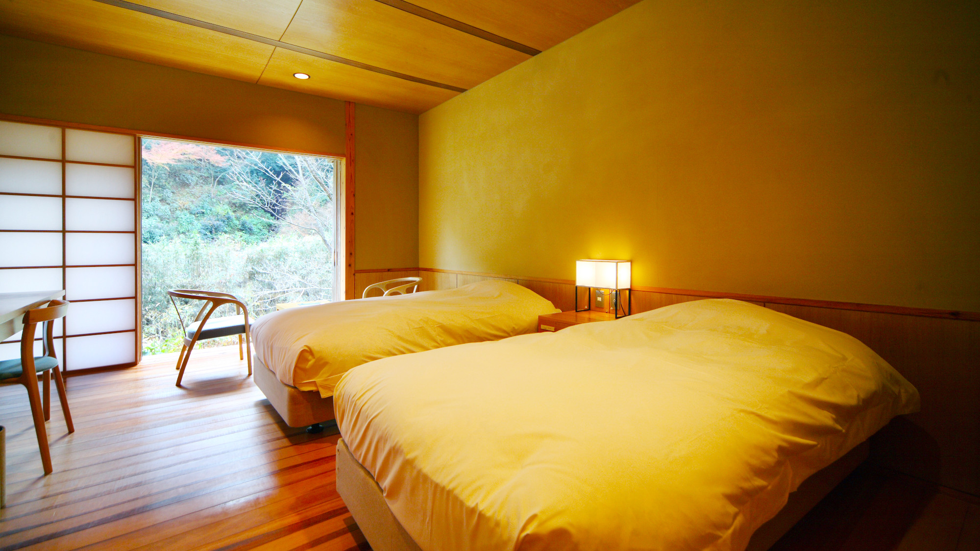 お部屋はツインベッドで広々と。離れ和洋室なら目の前の大自然を贅沢に感じることができます。