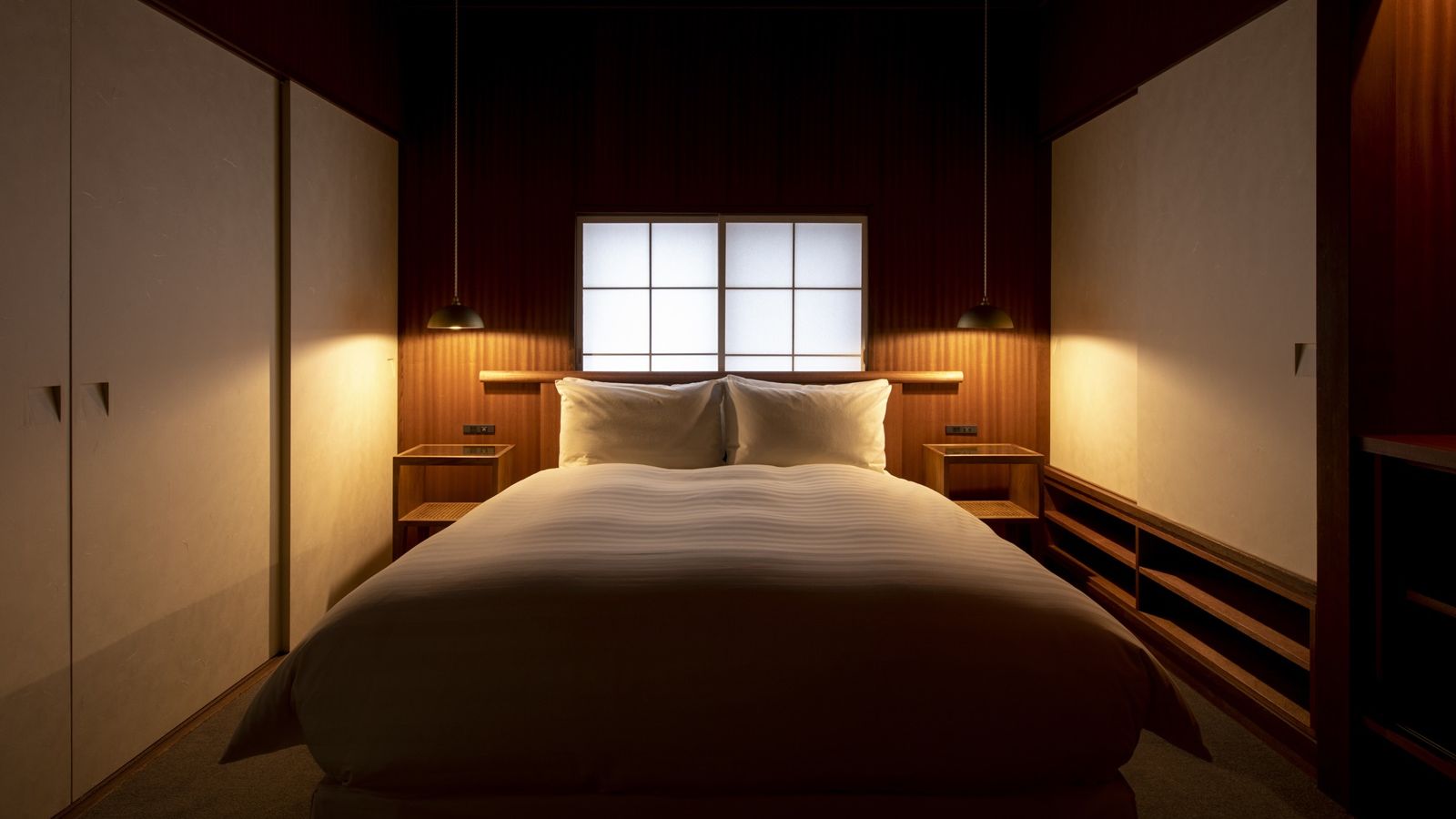 広い和室に和モダンベッドを置いた落ち着きのある空間。二間続きで広々と利用することができます。